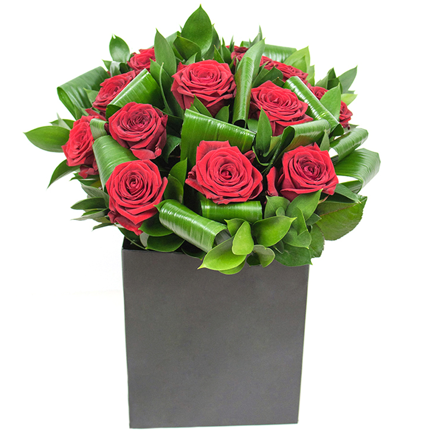 Celebrate classic beauty with our stunning bouquet, featuring vibrant red roses enhanced by aspidistra leaves and elegant ruscus. This unique floral design adds sophistication and charm to any space.